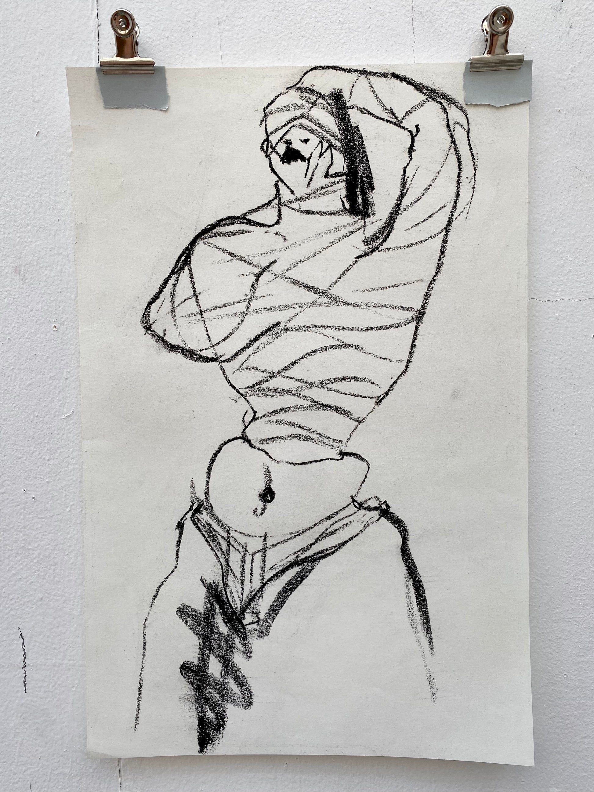 In this session we were drawing from a performance where Francoise was gradually wrapped in bandages by Alex until almost completely mummified. This mummification process created many shapes I had never drawn - a total joy.